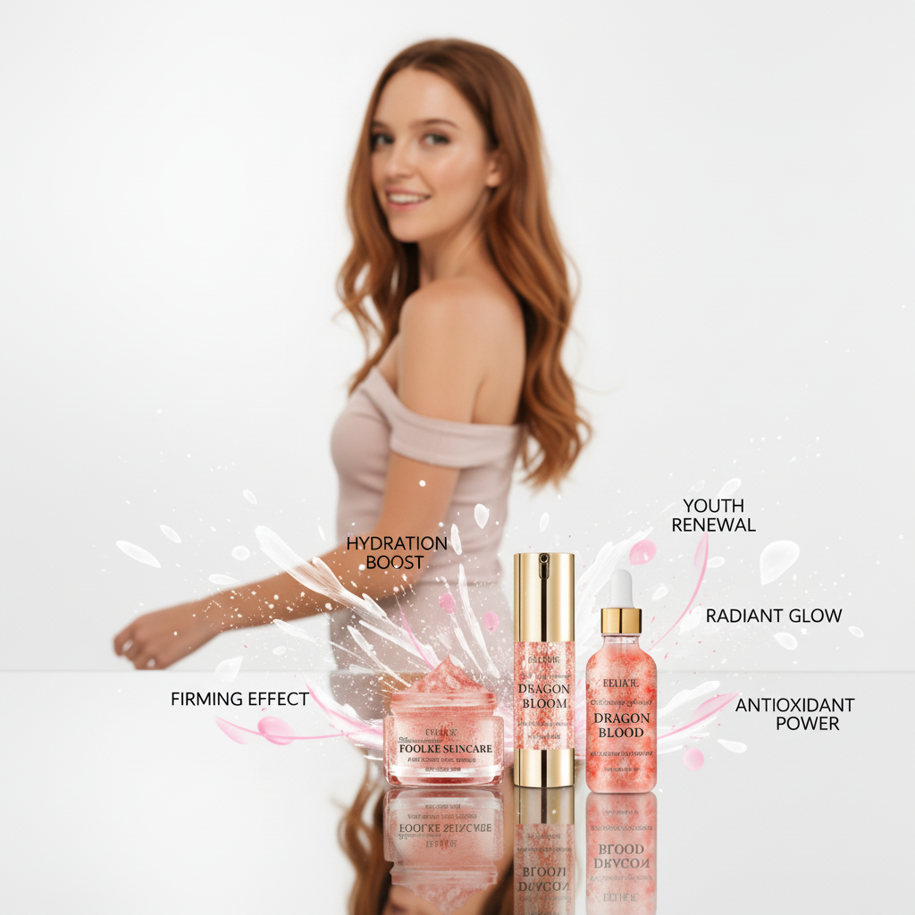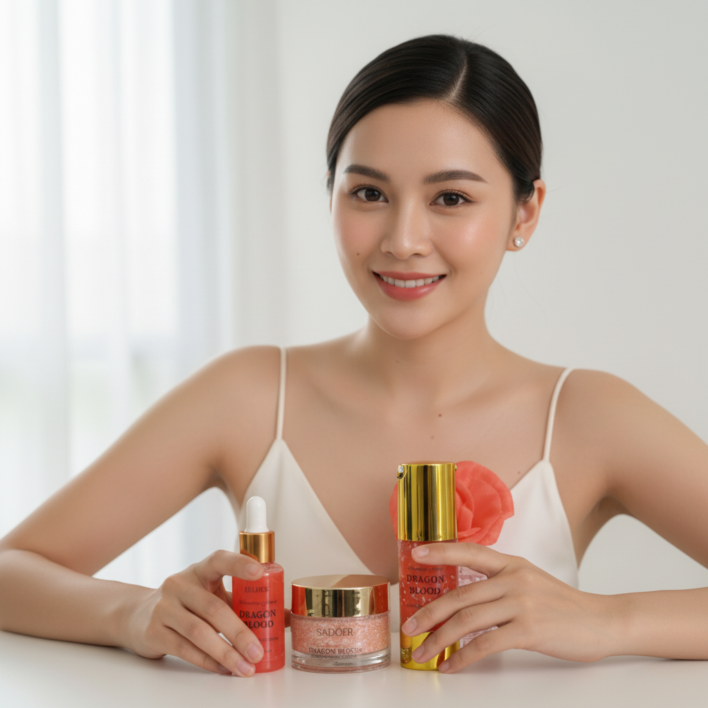 Cream, lotion, and serum from the Korean Dragon’s Blood skincare line, designed to hydrate, brighten, and achieve porcelain-like skin.